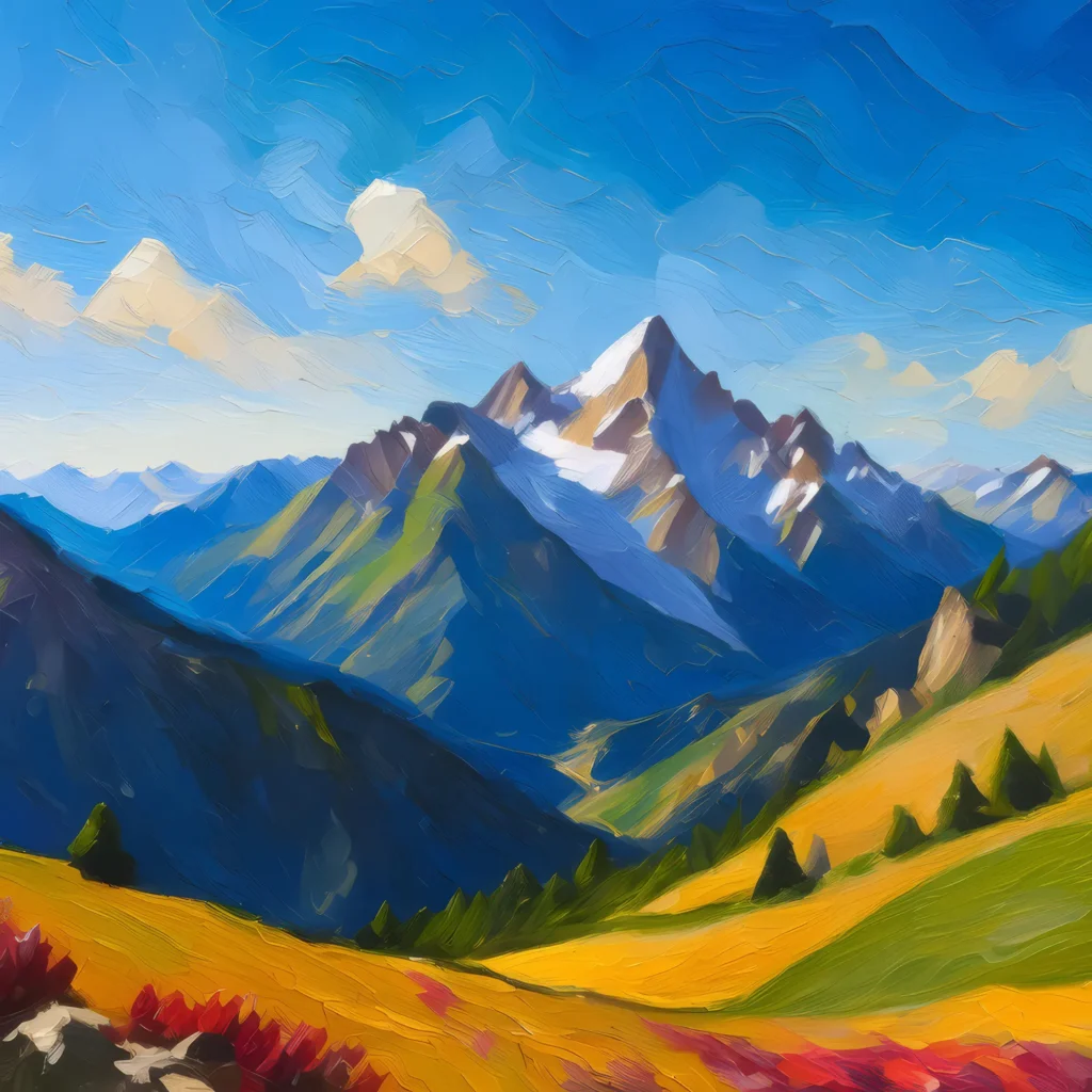 A panoramic view of a majestic alpine mountain range under a bright, clear blue sky.