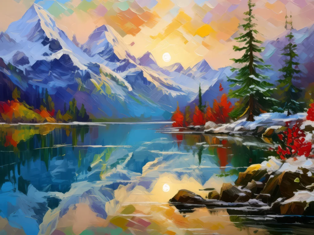 A serene alpine lake reflecting the sunrise and surrounding snow-capped mountains.
