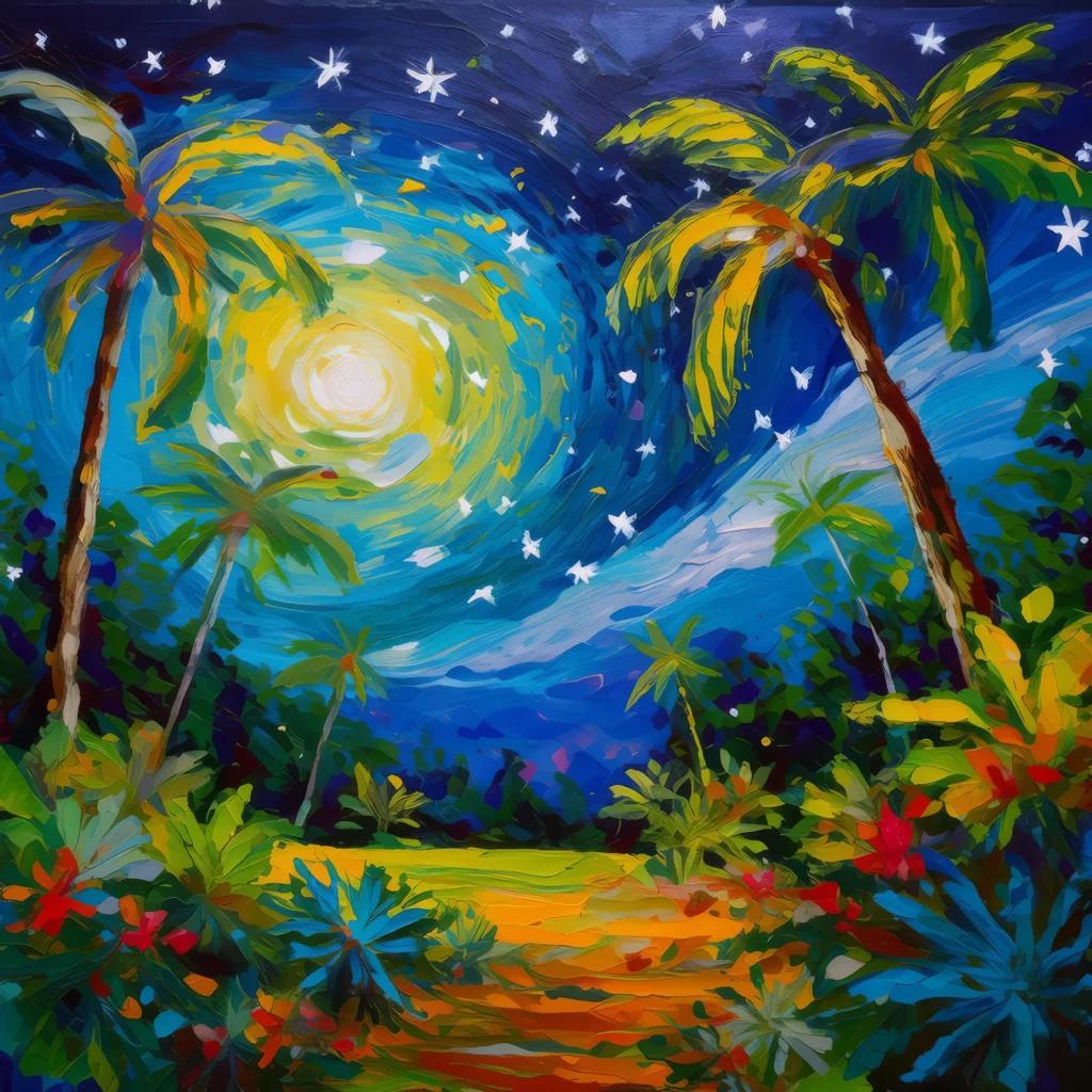 A starlit clearing in a tropical jungle offers a breathtaking view under the open sky.