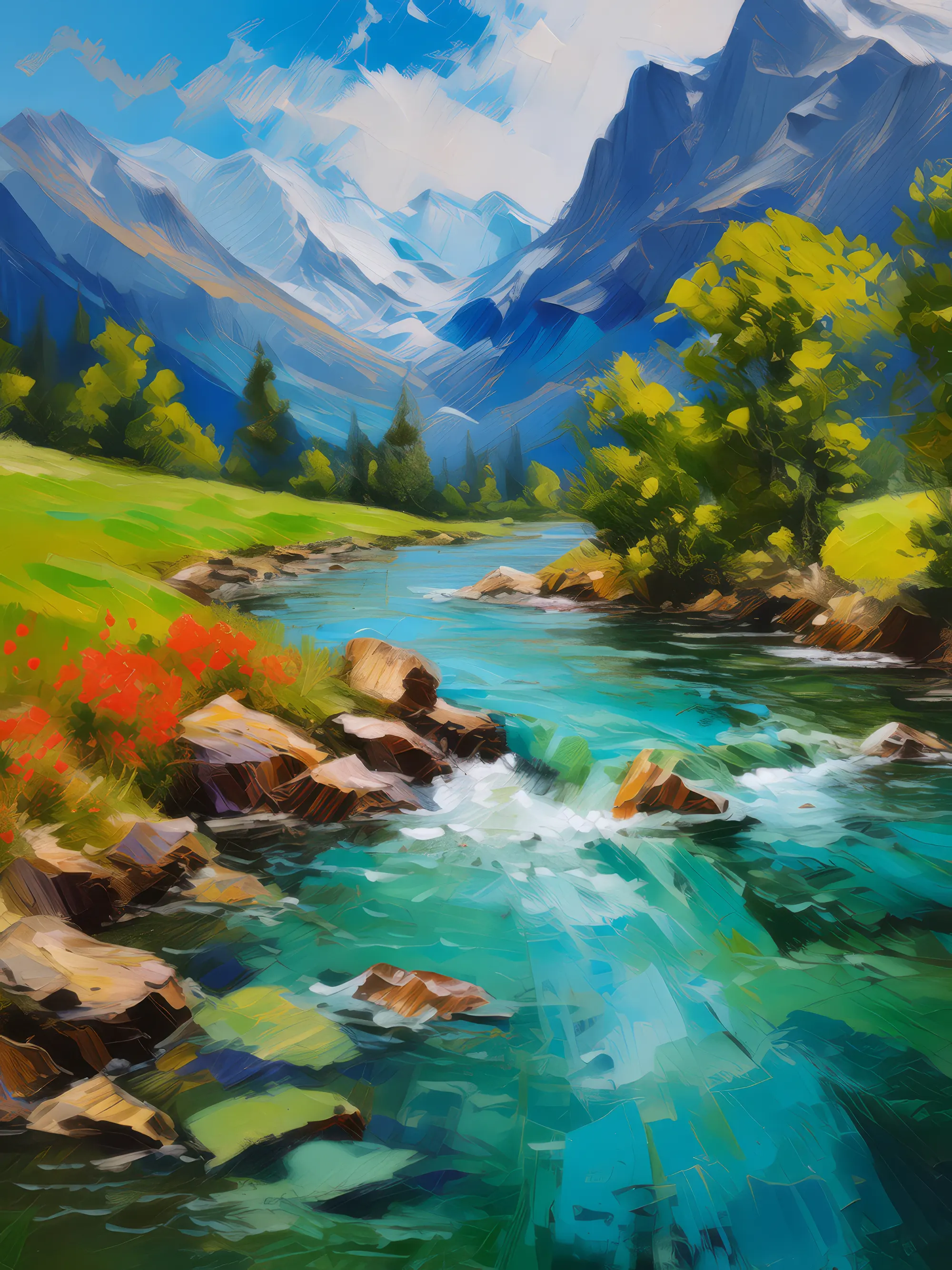 Alpine River CrossingBy Emma Mickelberg / September 30, 2020 A pristine alpine river with crystal-clear water flowing through a rocky landscape and green meadows. Painted in 2005. View ‘Alpine River Crossing’ on Society6