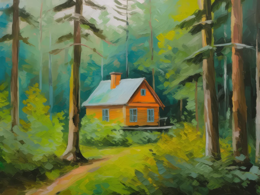 A cozy cabin hidden deep in the forest, surrounded by towering trees and lush greenery.