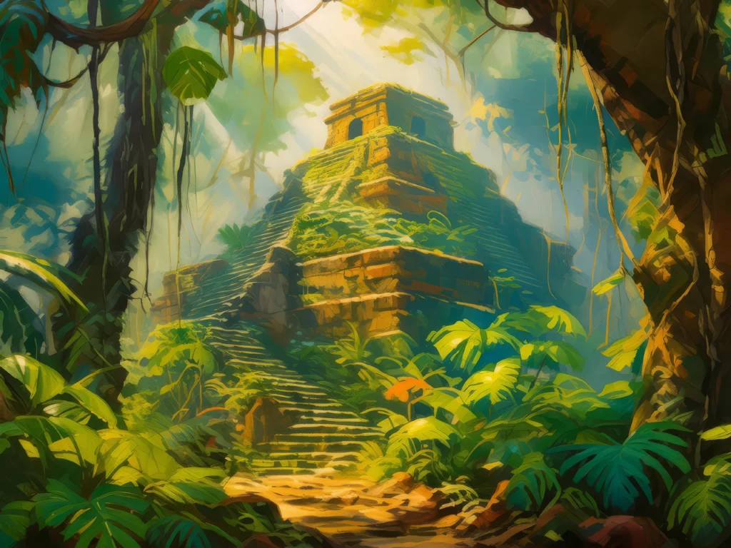 Deep in the jungle, the lost ruins of an ancient civilization are overtaken by vines and roots, with dapples of sunlight illuminating hidden glyphs
