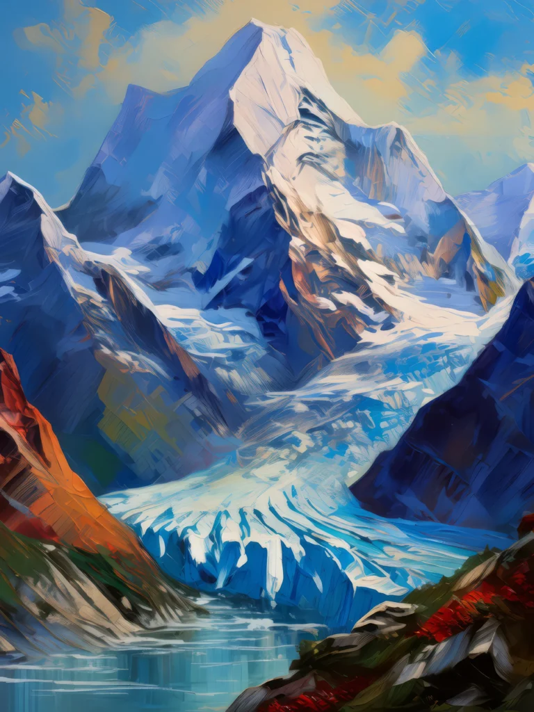 A panoramic view of a majestic alpine glacier with icy blue hues and rugged mountain peaks.