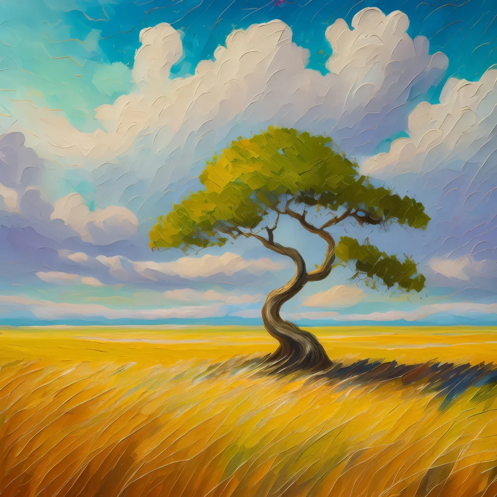 A lone, twisted tree standing amidst the vast expanse of a tropical steppe, under a cloudy sky.
