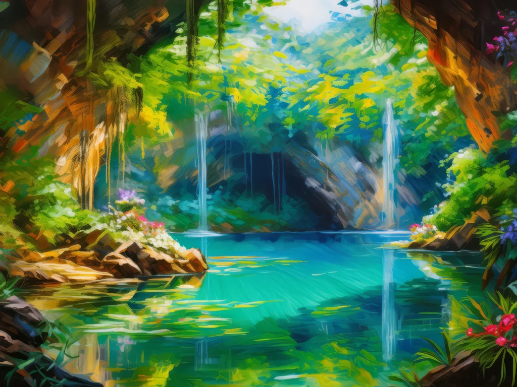 A beautiful grotto with an emerald-green lake, surrounded by dense, verdant foliage.
