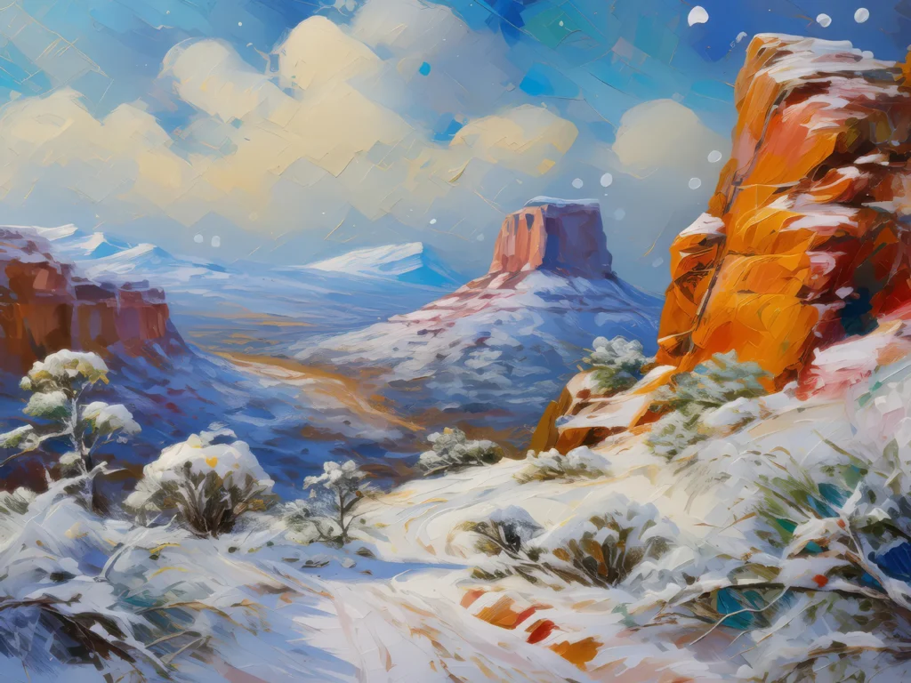 A mesa covered in a light snowfall, creating a winter wonderland scene.