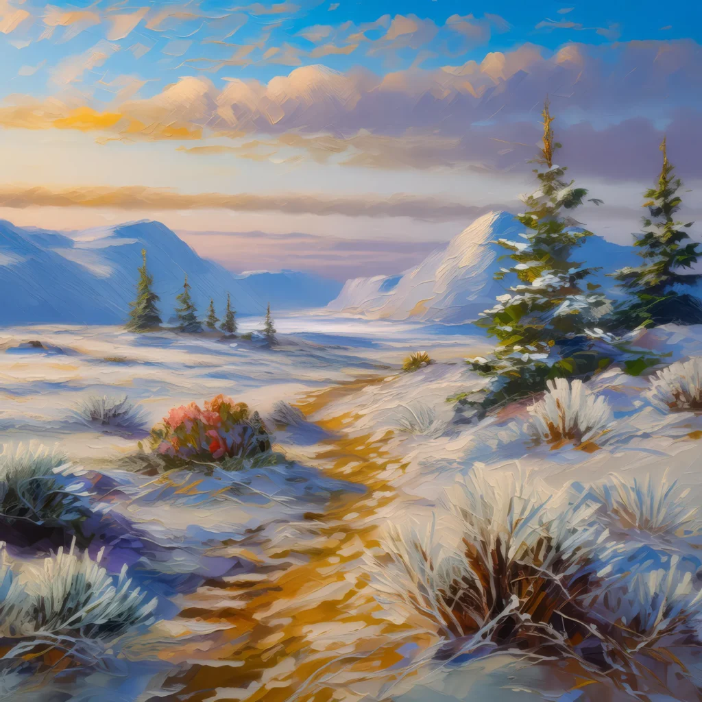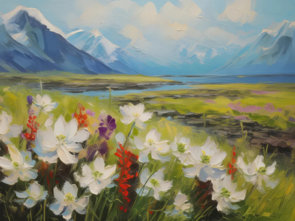 Arctic flowers blooming in an arctic grassland, adding vibrant colors to the landscape.