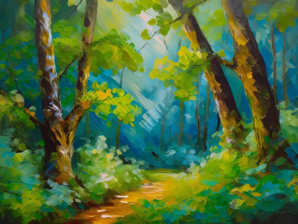 A secluded spot under towering trees in a temperate forest, draped in vibrant green leaves.