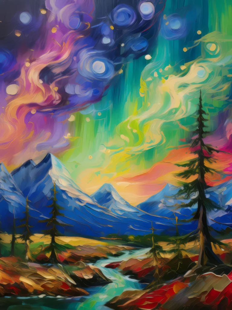An ethereal aurora borealis dances above a serene boreal desert landscape.