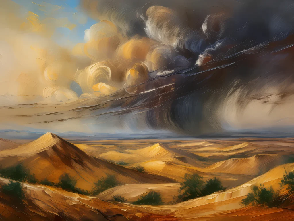 A sandstorm rolling in across a desert landscape, with dark clouds and swirling sand.