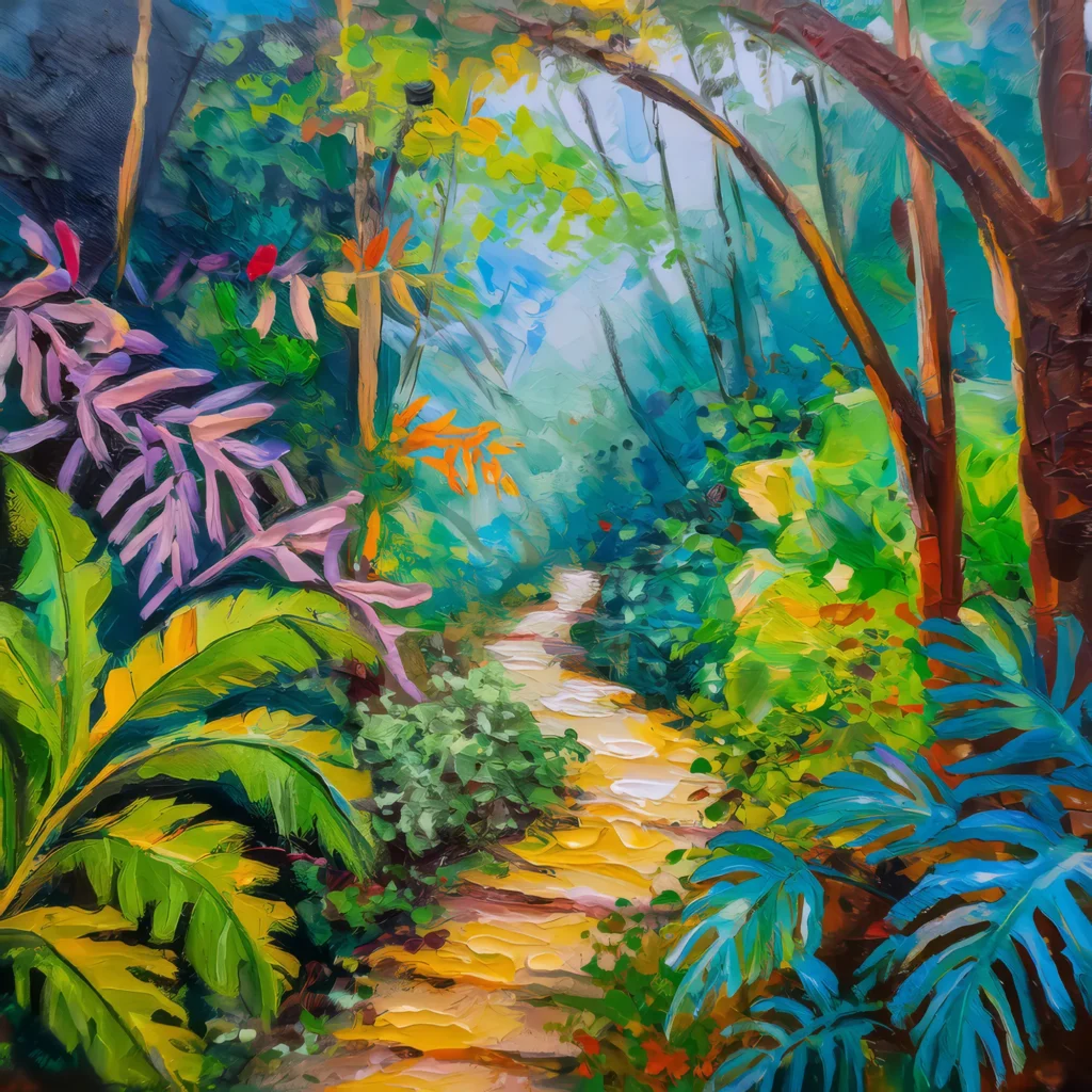 A narrow, winding trail snakes through the dense undergrowth of a tropical jungle.