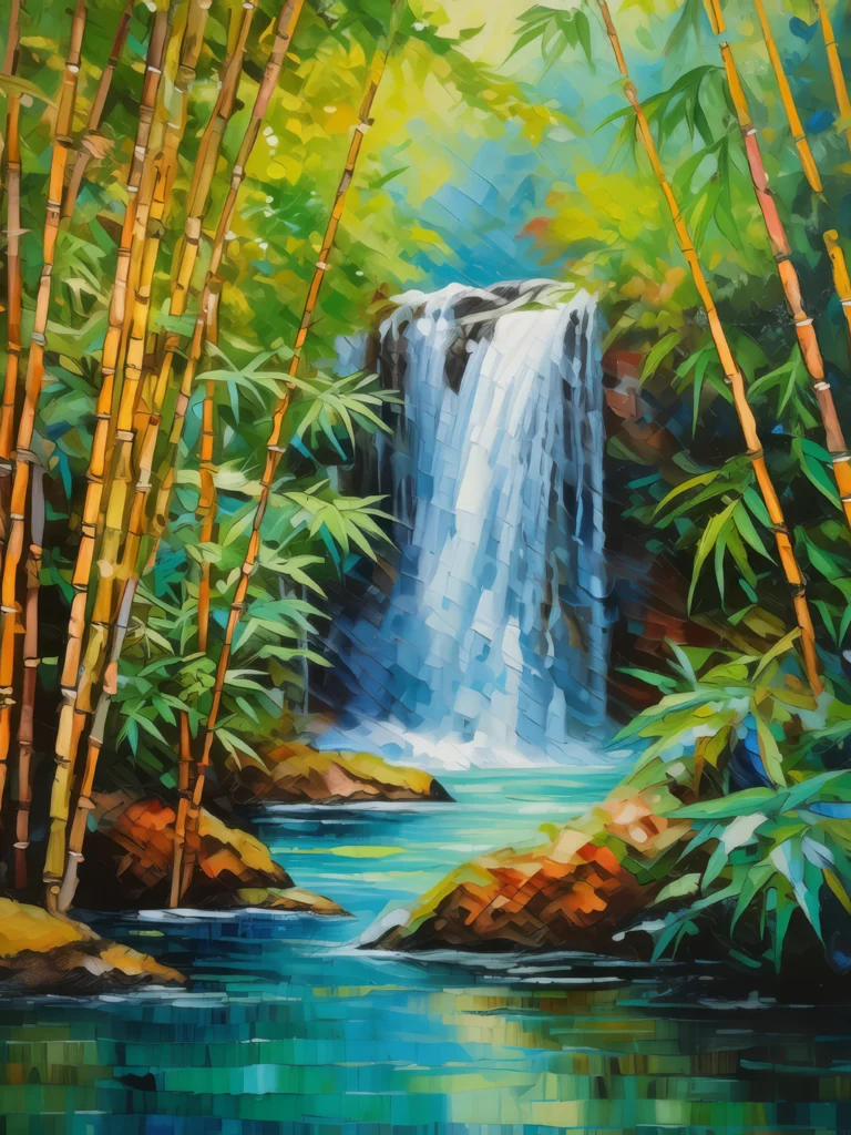 A serene waterfall hidden within a dense bamboo grove, peaceful and secluded.