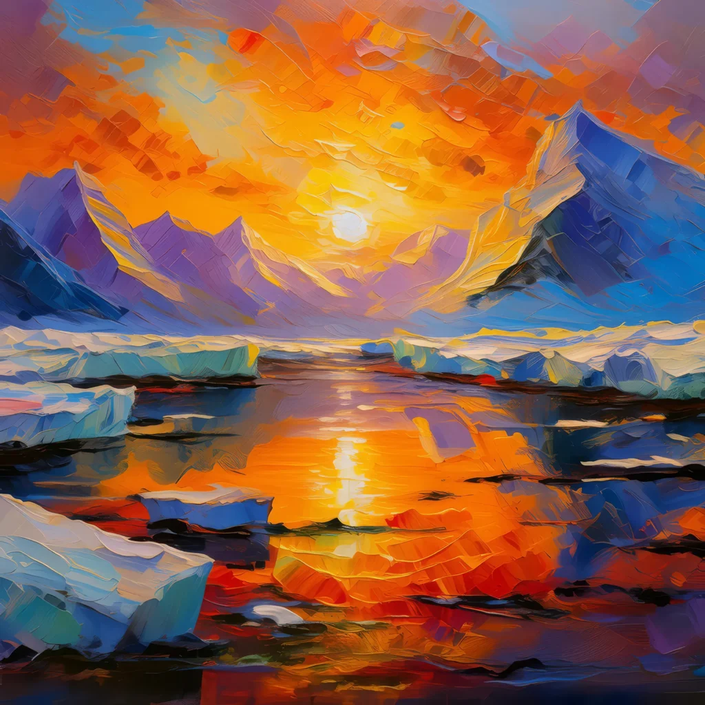 A stunning sunset over the polar desert with glaciers reflecting the orange light.