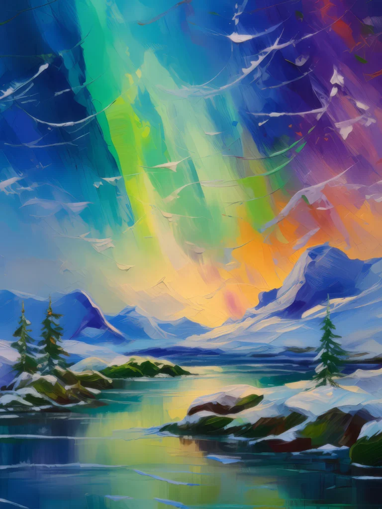 The aurora borealis dances vividly over a frozen landscape in the polar tundra.