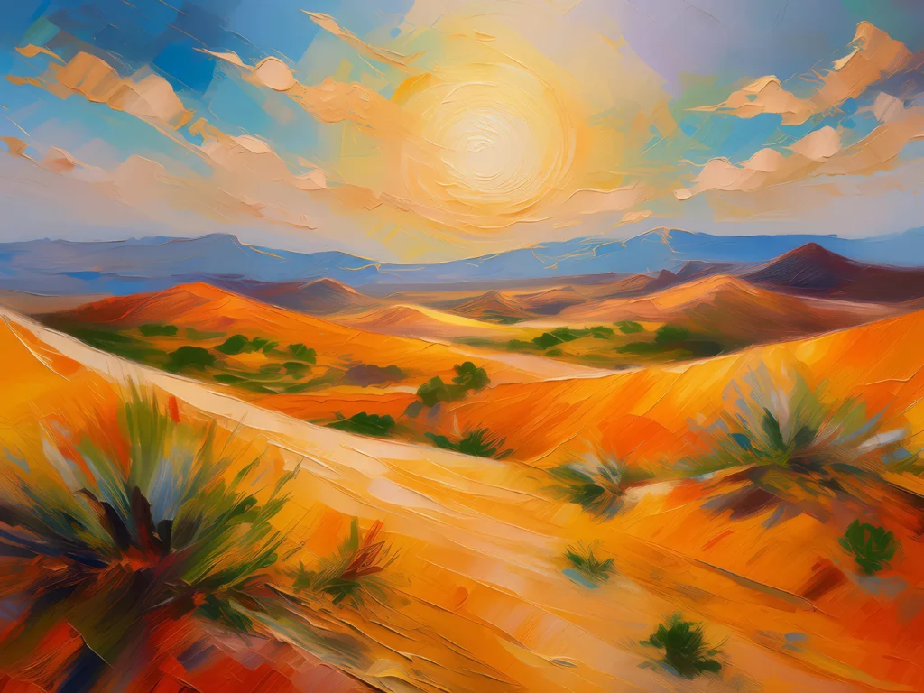 Expansive desert dunes under the intense sun at high noon, with sharp shadows and minimal vegetation, showcasing the harsh beauty of the desert.