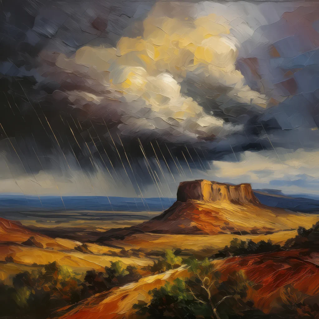 A mesa with dark rain clouds looming overhead, creating a dramatic scene.