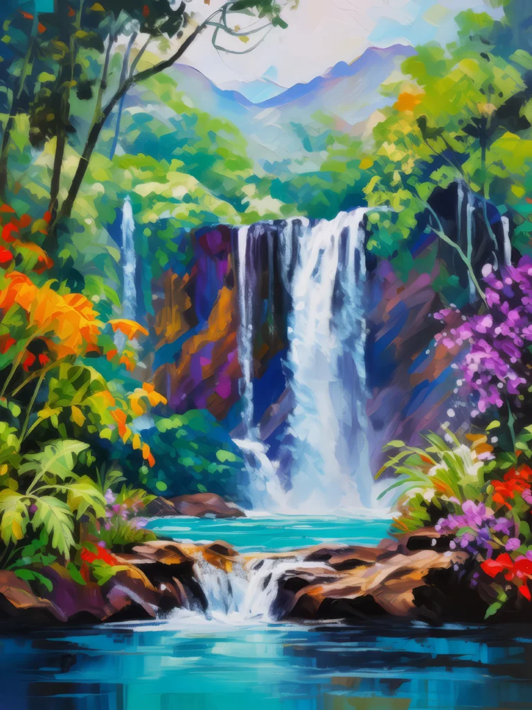 A majestic waterfall in a tropical rainforest, with water splashing onto rocks and plants.