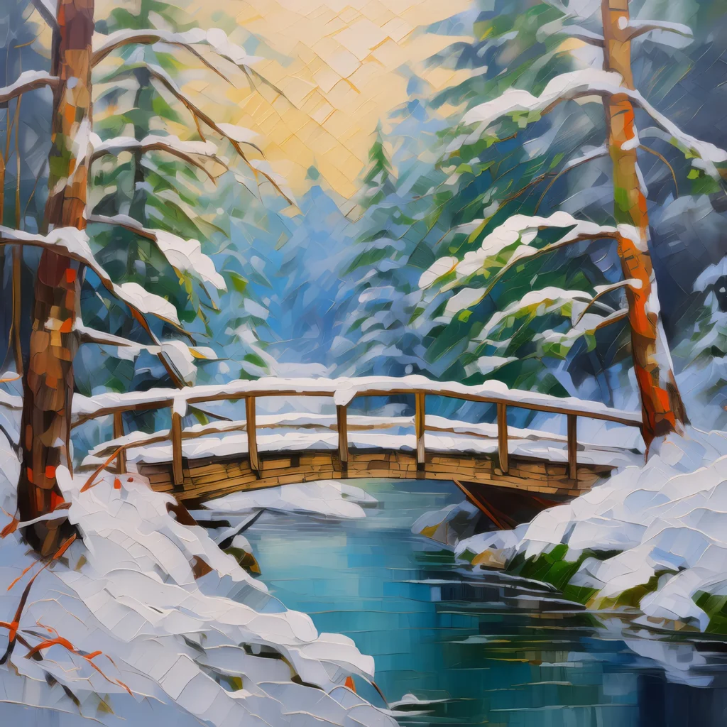 A wooden bridge covered in snow, spanning a frozen river in a polar forest.