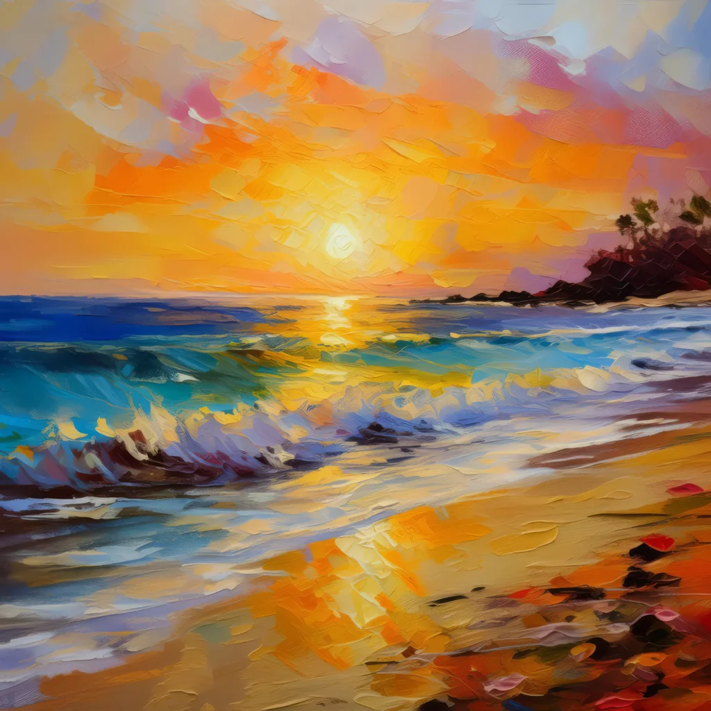 A breathtaking sunset over golden sandy beach with gentle ocean waves.