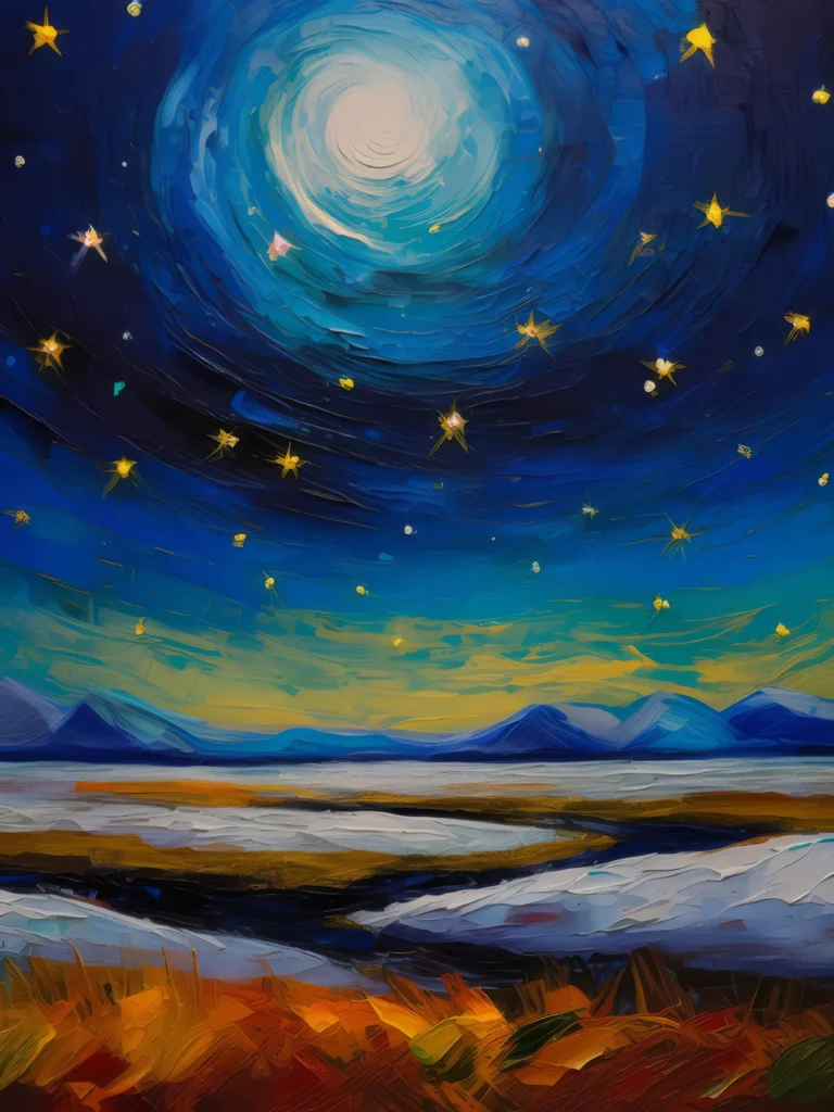 The polar tundra lays serene and still under the quiet night sky, stars twinkling above.