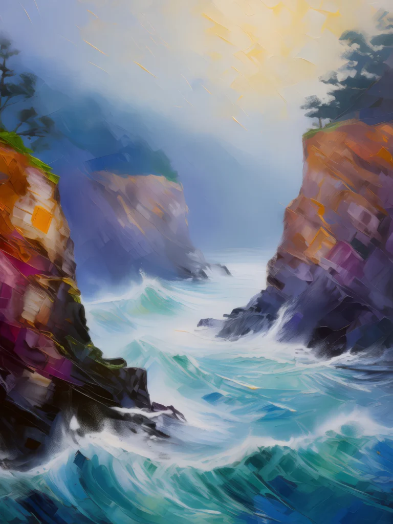 A mysterious chasm along a foggy coastal cliff with crashing waves below.