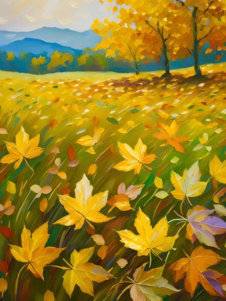 Golden autumn leaves scattered across a grassland with a crisp breeze.