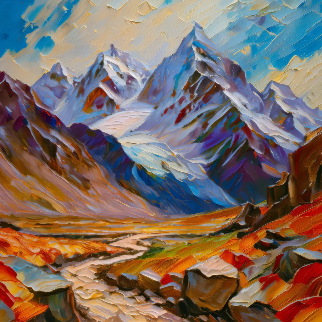 Snowy mountain peaks tower above the dry, rocky terrain of an alpine desert.