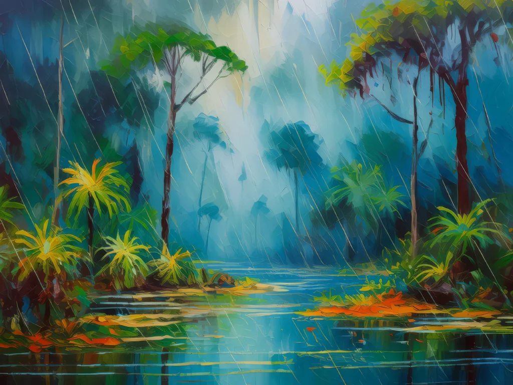 A heavy rainstorm pouring over a dense tropical swamp, creating ripples in the water.