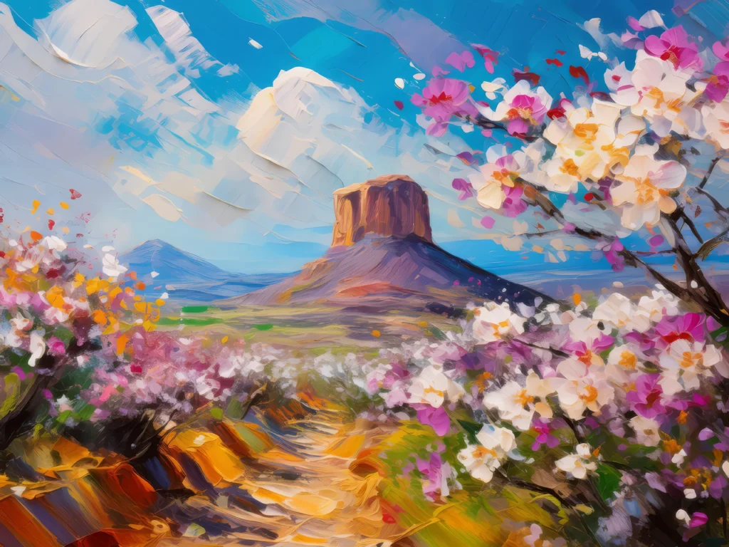 Spring blossoms in full bloom surrounding a mesa under a bright sky.