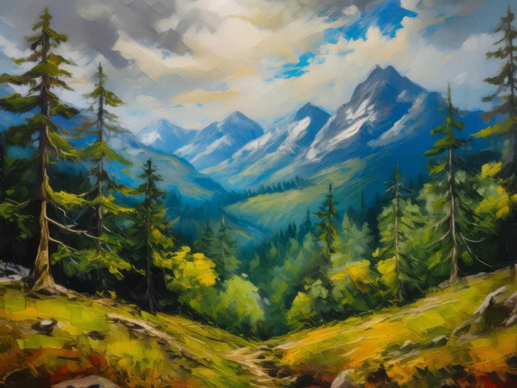 A dense, silent forest in the heart of the alpine region under a cloudy sky.