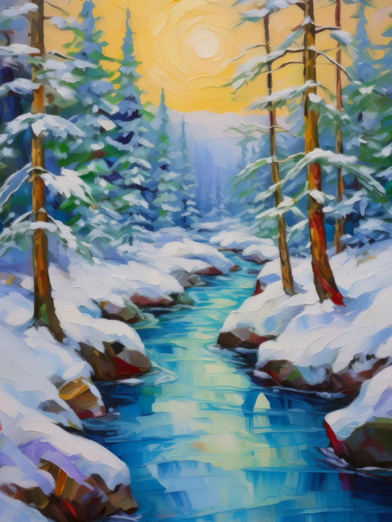 A frozen streambed winding through a polar forest, covered in ice and snow.