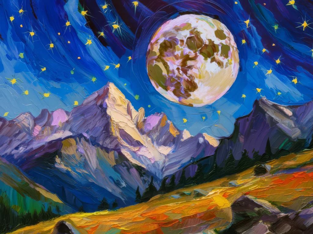 Full moon rising above the rugged terrain of the Alpine landscape under a starry sky.
