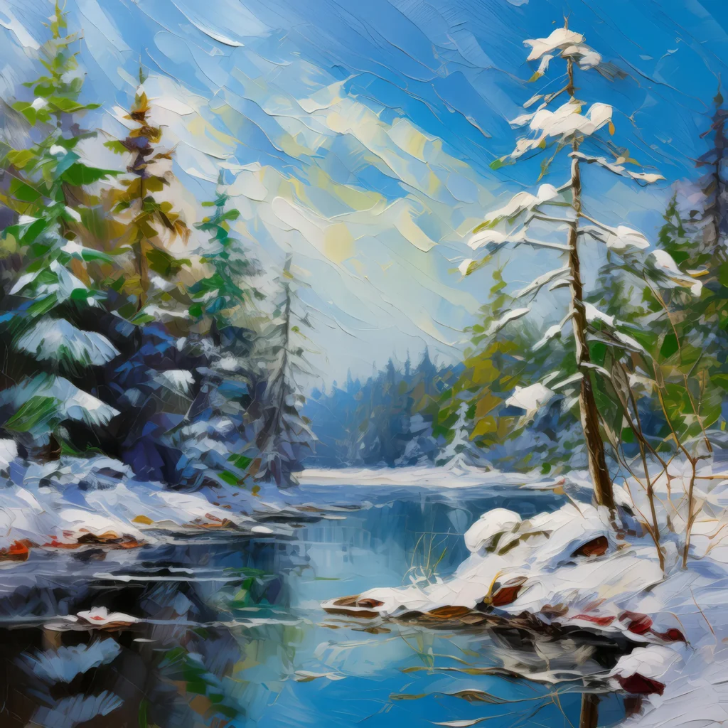 A frozen lake in a boreal forest, with snow-covered trees and a clear blue sky.