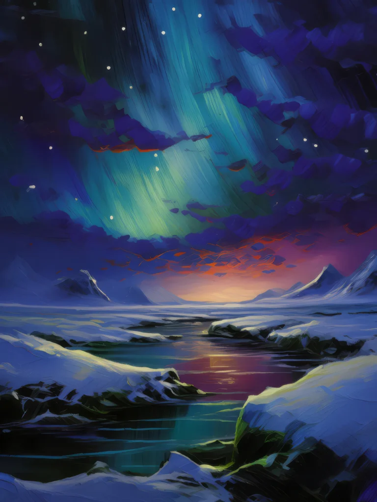 An Arctic village blanketed in snow under the aurora borealis, with the colorful lights reflecting off icy surfaces and smoke rising from chimneys