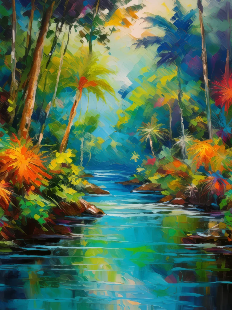 A tranquil watercourse flows gently through a lush tropical jungle, surrounded by vibrant foliage.