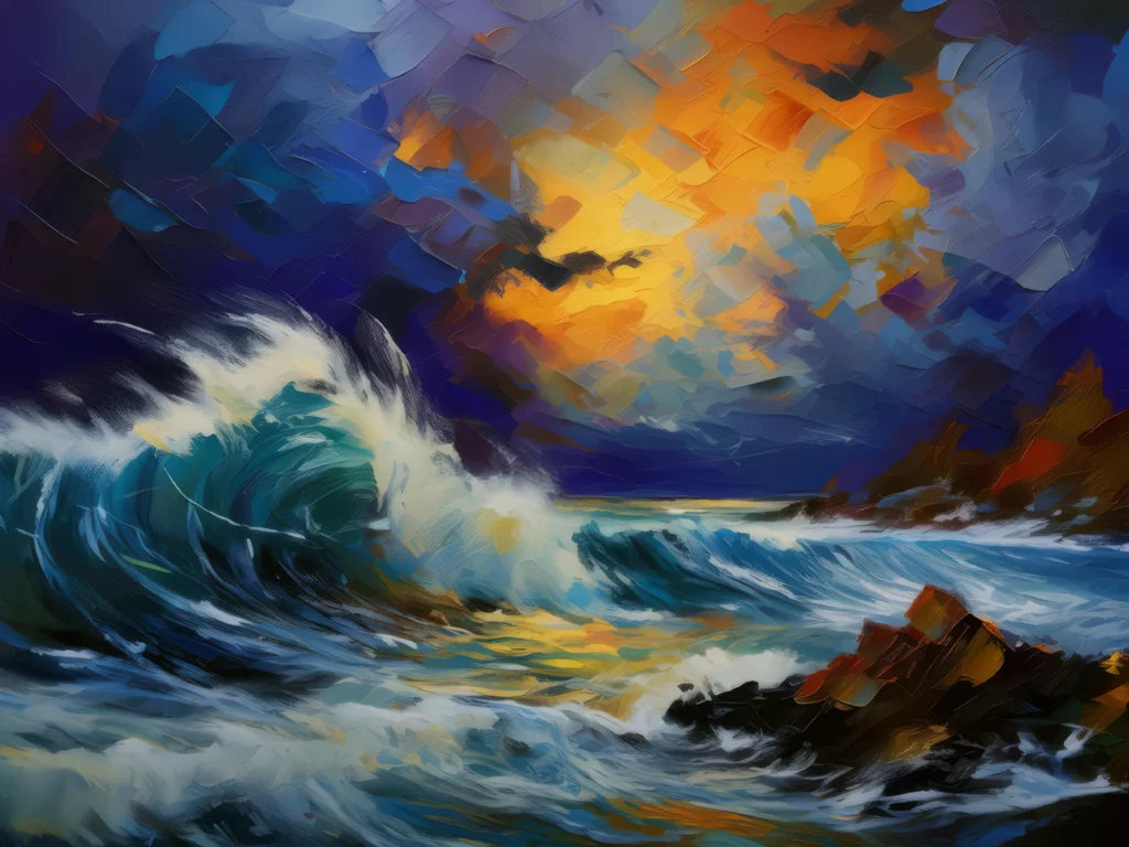 A dramatic ocean storm brewing with dark clouds and rough, crashing waves.