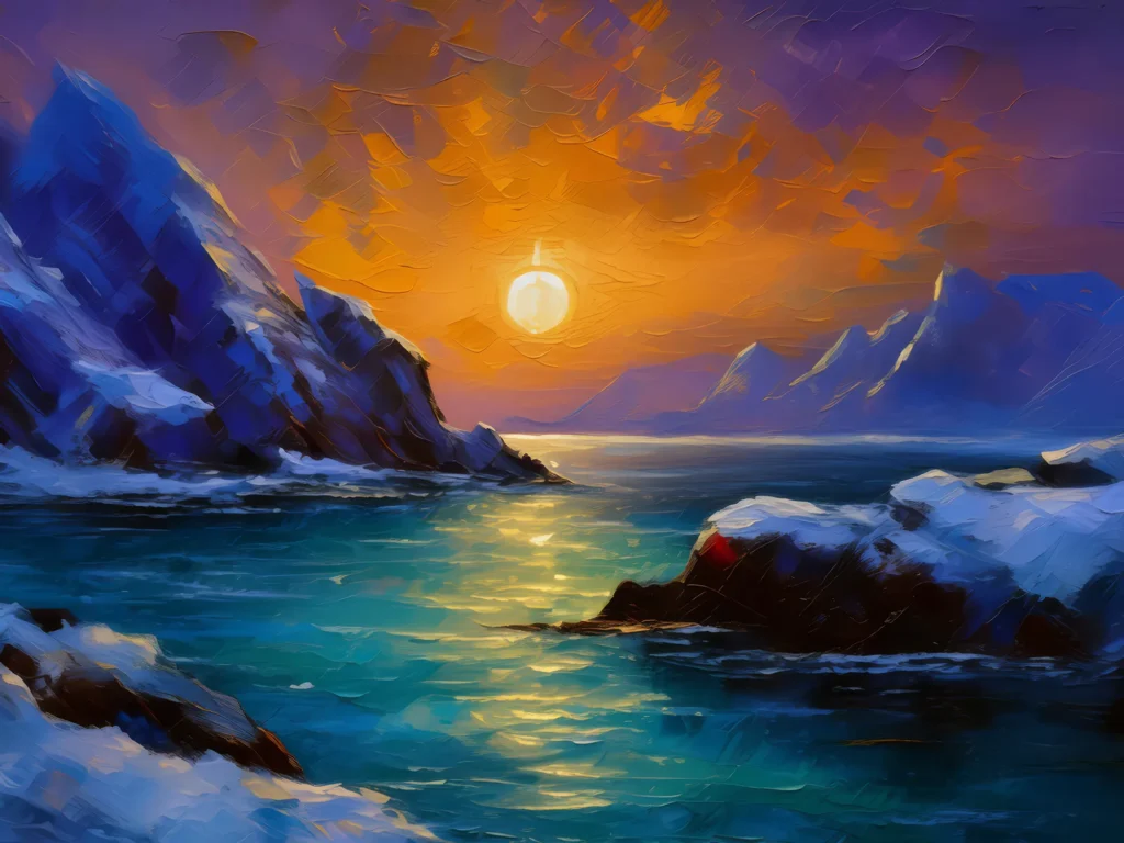 Dusk in the polar desert, casting long shadows over the icy landscape.
