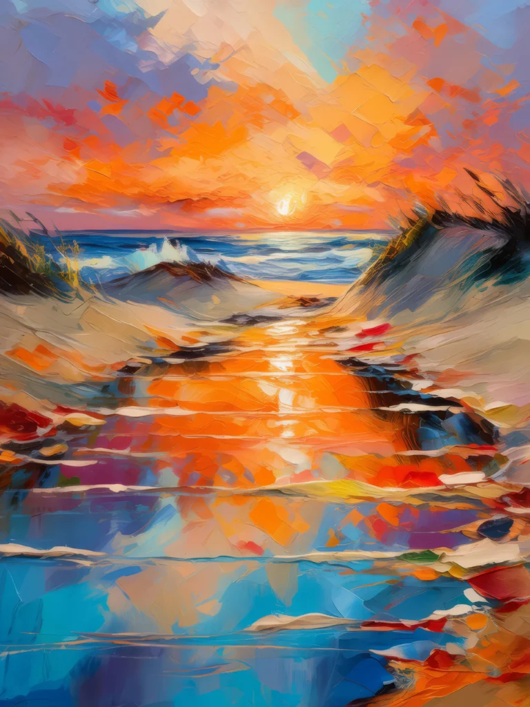The reflection of a vibrant sunset on the surface of sand dunes.