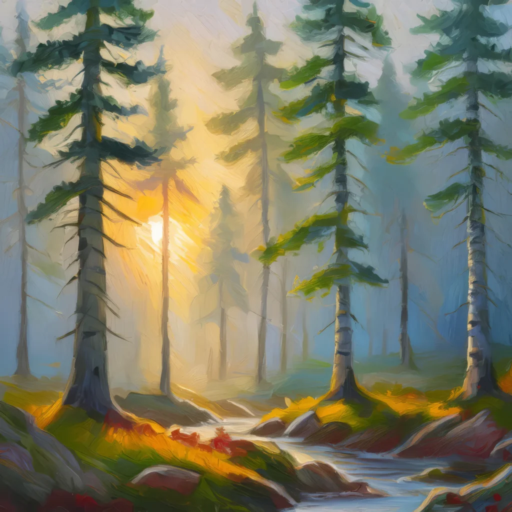 A boreal forest shrouded in fog with the sun rising and casting soft light through the trees.