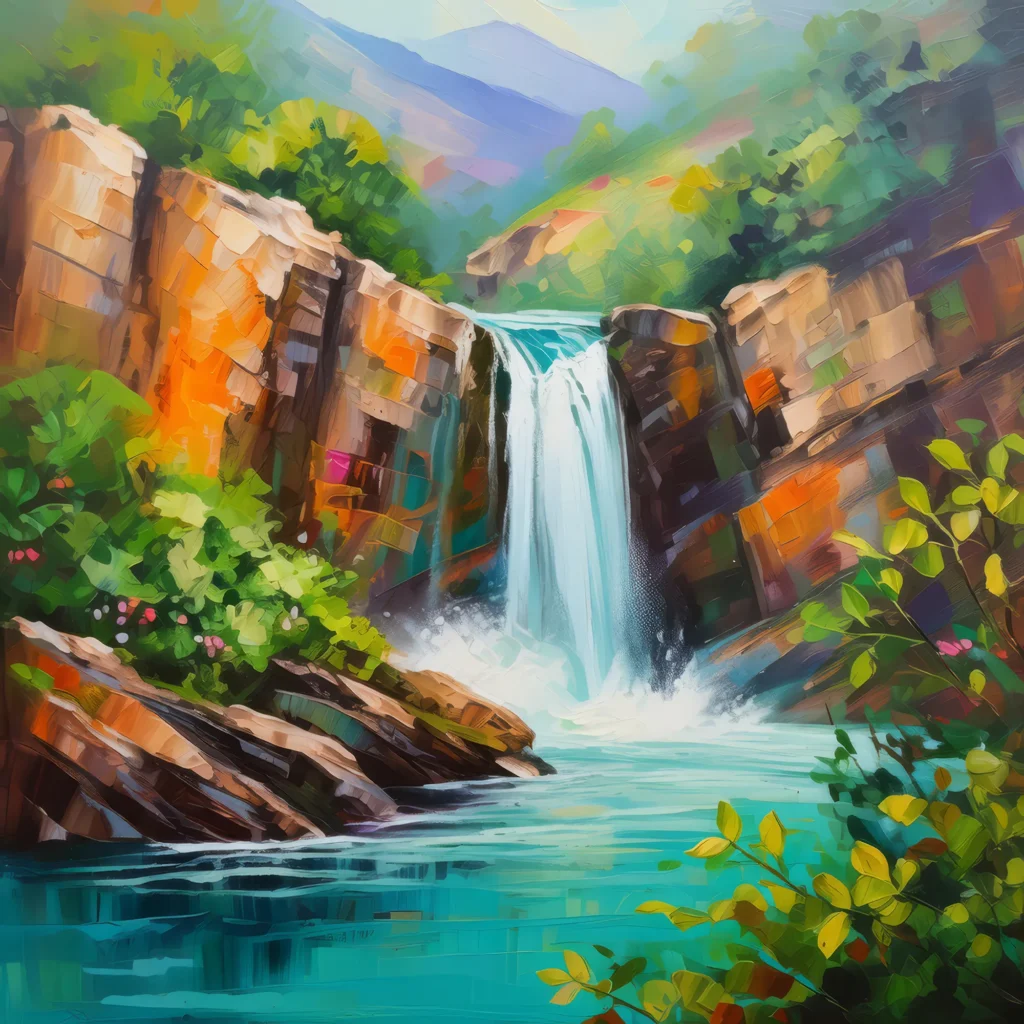 A majestic waterfall slicing through a rocky gorge, surrounded by vibrant greenery.