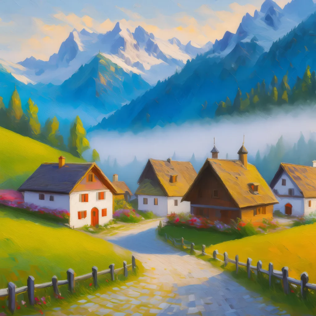 Morning fog enveloping a quaint Alpine village, with cobblestone streets and traditional homes.
