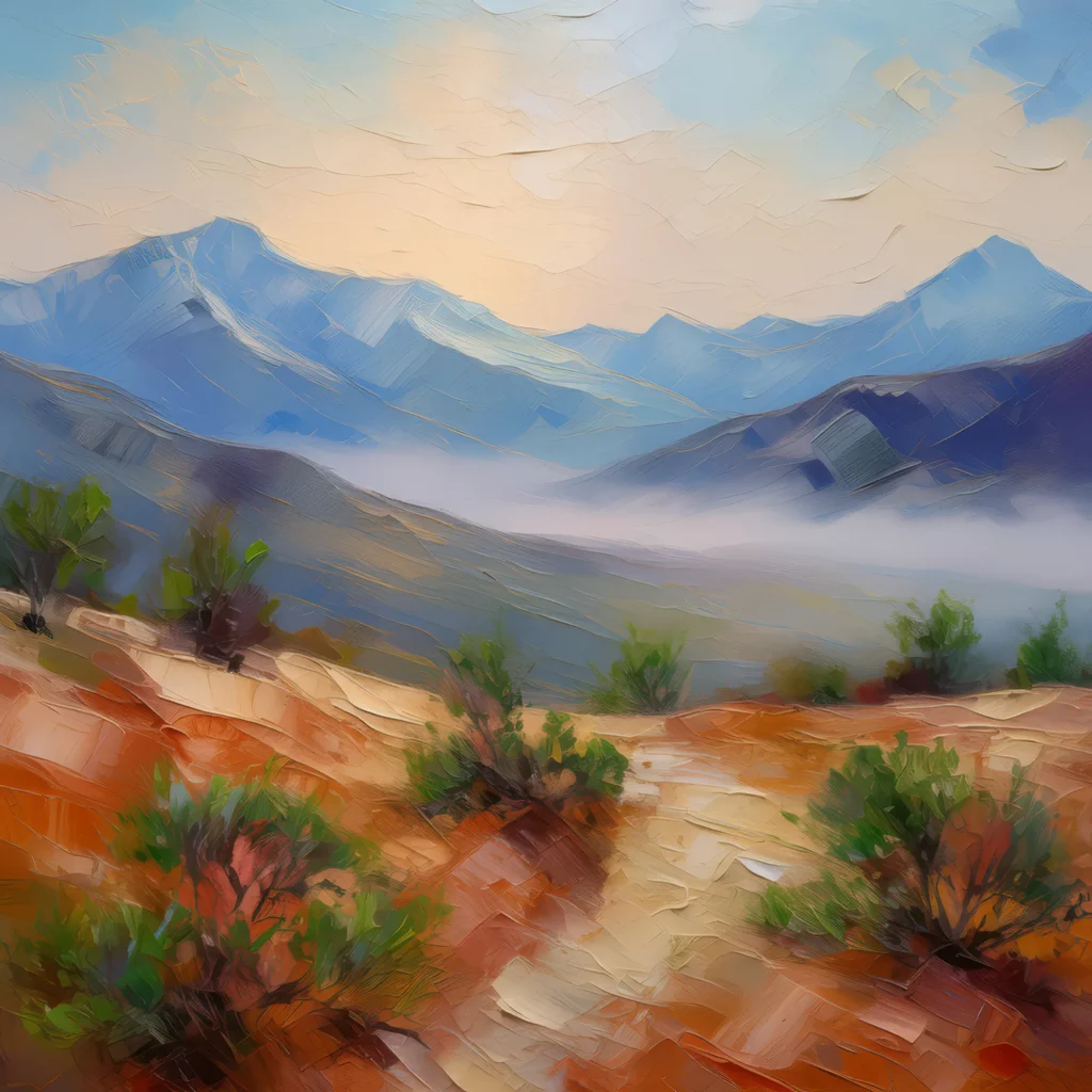 Early morning mist hangs over an alpine desert with sparse vegetation and distant mountains.