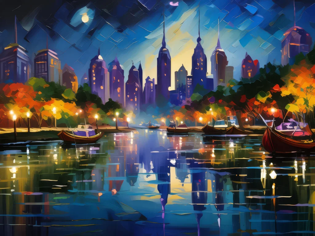 A nighttime view of a cityscape reflected in a river, with skyscrapers lit up and small boats floating by, creating a vibrant urban tapestry