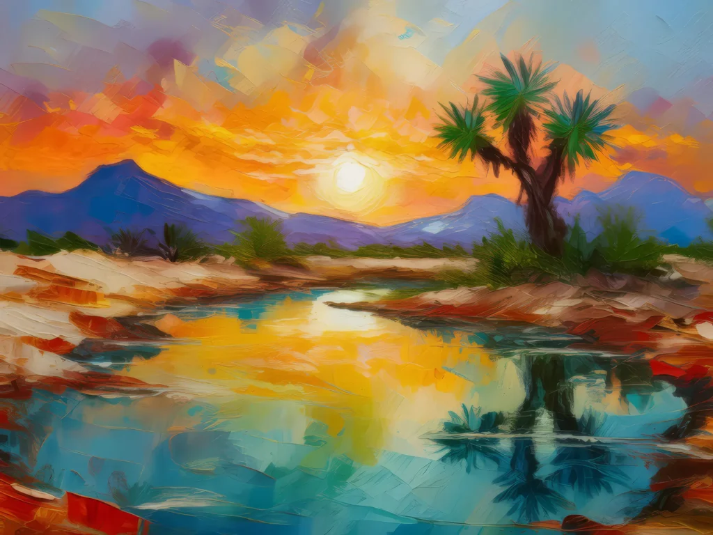A vibrant sunset reflecting in a small pond amidst the tropical desert dunes.