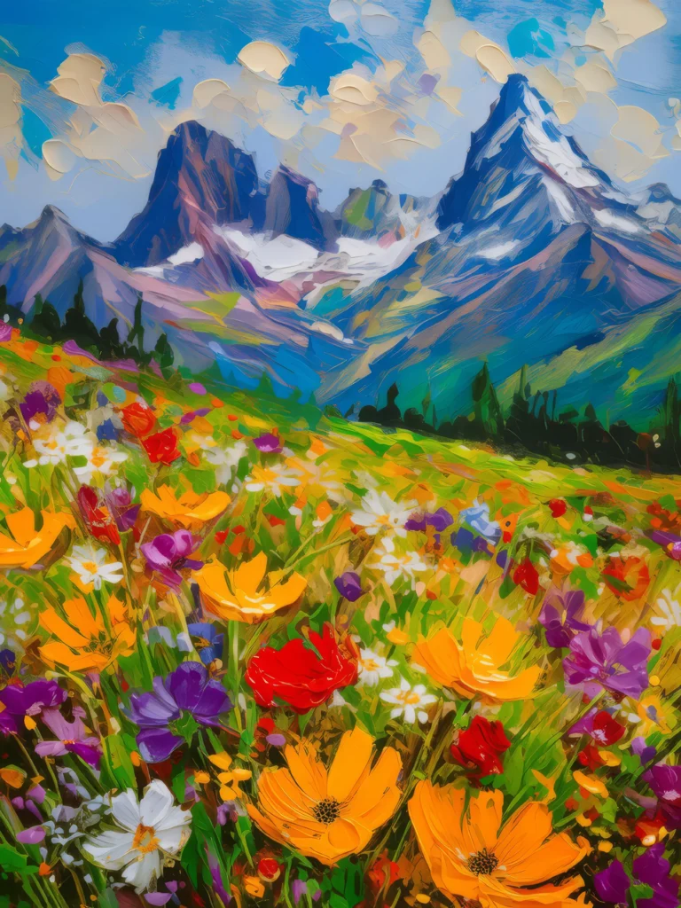 Wildflowers blanket the foreground with towering alpine peaks in the background.