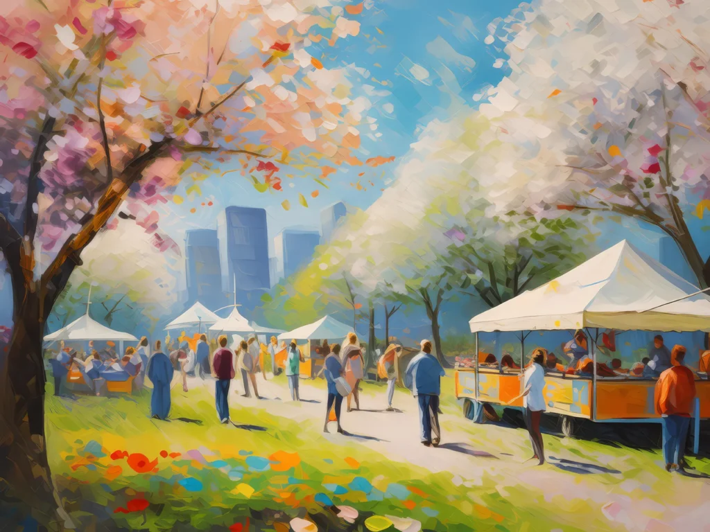 A city park during a spring festival, bustling with families, food trucks serving seasonal treats, and bands playing under blossoming trees.
