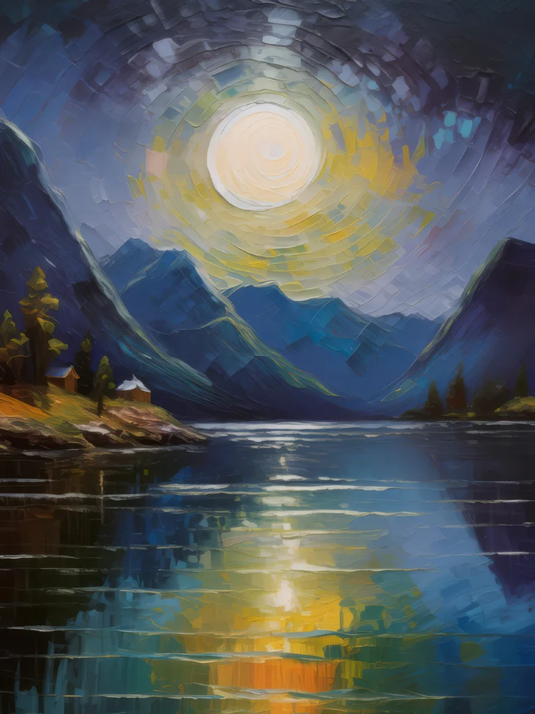 Moonlight casts a silver glow over the fjord, creating a serene sonata of light with reflections dancing on the water.