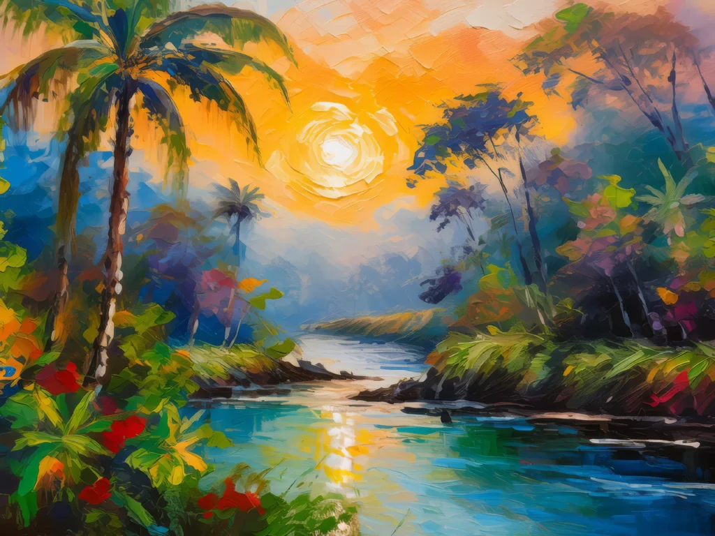Sunrise illuminates a winding river cutting through the dense tropical jungle.