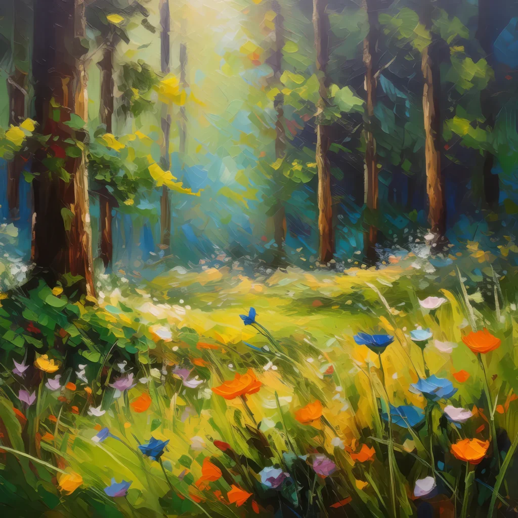 A peaceful meadow within a forest, filled with wildflowers and gentle sunlight.