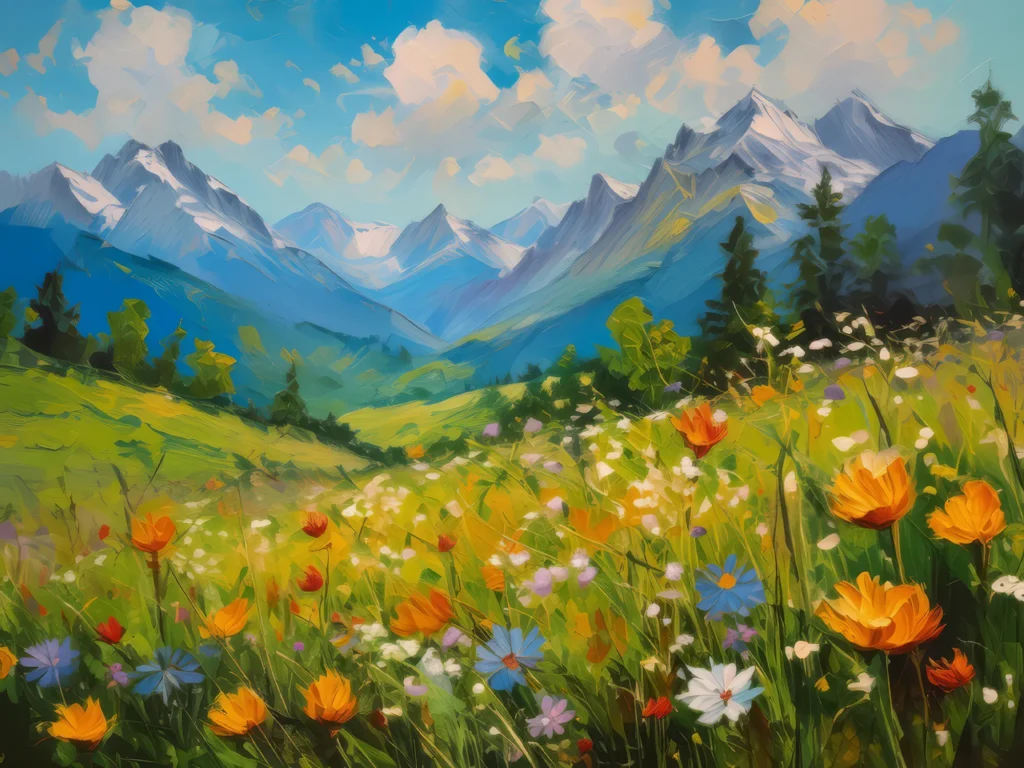 A peaceful alpine meadow, dotted with wildflowers and framed by distant mountain peaks.
